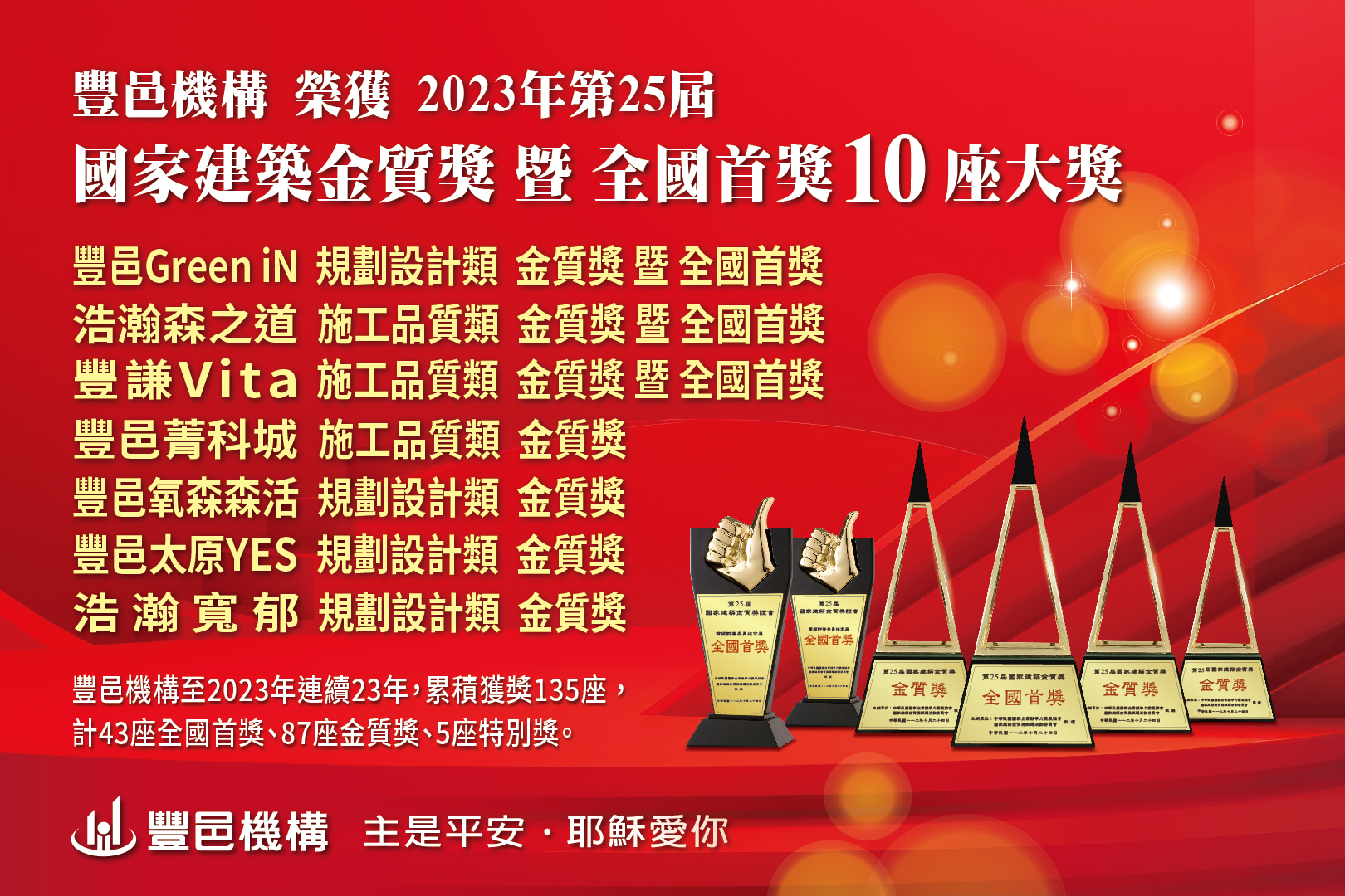 感謝 神豐盛的祝福恩典、感謝每一位盡心盡力的同仁、感謝評委們的青睞與肯定,豐邑機構已連續22年榮獲建築金質獎肯定,累積獲獎135座,其中有43座全國首獎、87座金質獎、5座特別獎(優質獎、鑽石金首獎、卓越金首獎、最佳創意設計)