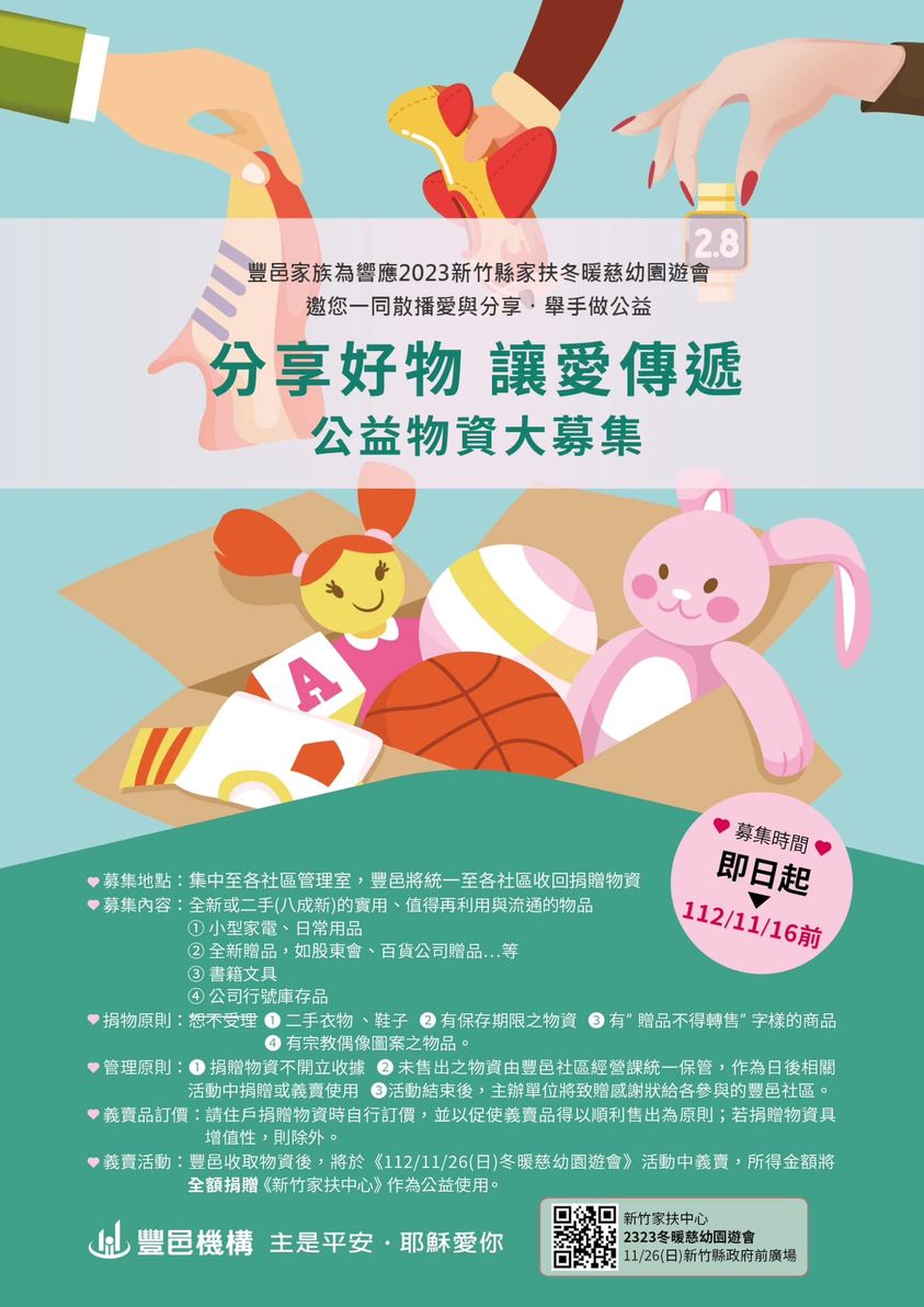 誠摯邀請新竹豐邑家族社區住戶們,歡迎提供家中全新或八成新的實用物品,一同來響應義賣活動並關懷新竹地區弱勢家庭及寄養受虐兒童。 義賣品募集地點:豐邑家族各社區管理室 義賣品募集時間:即日起~11/16(四)止【2023新竹家扶中心冬暖慈幼園遊會】